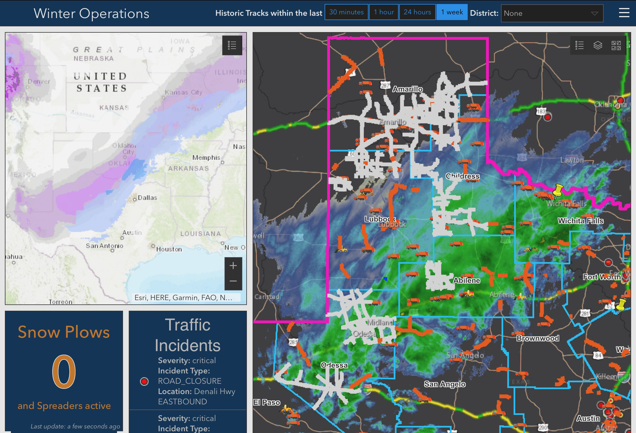 GIS as a realtime Common Operating Picture: Winter Storm Operations dashboard with realtime GPS snow plow tracking, weather and road conditions.