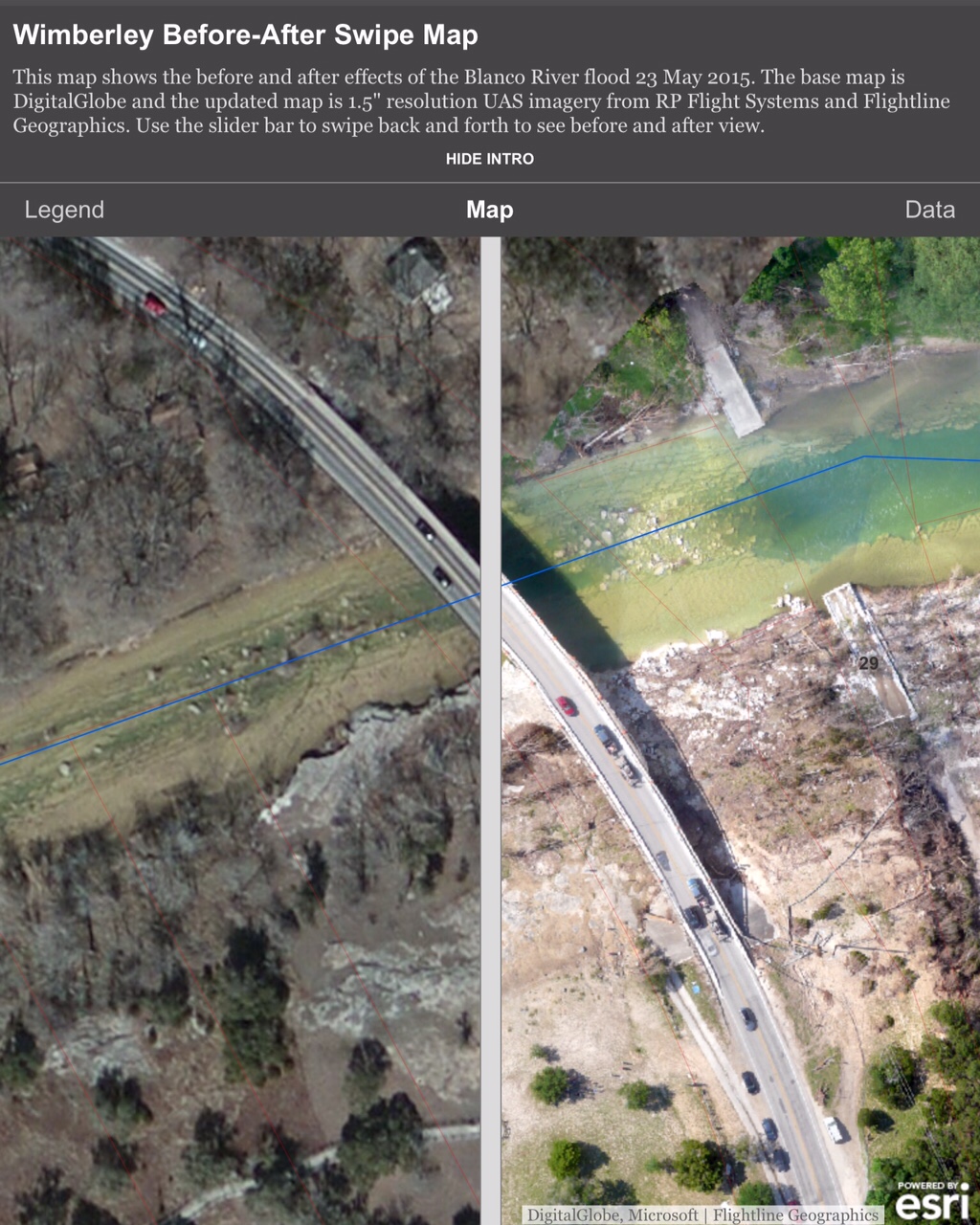 Check our our Online Swipe Map that compares before and after drone imagery of Blanco River Flood Disaster in Wimberley, TX
